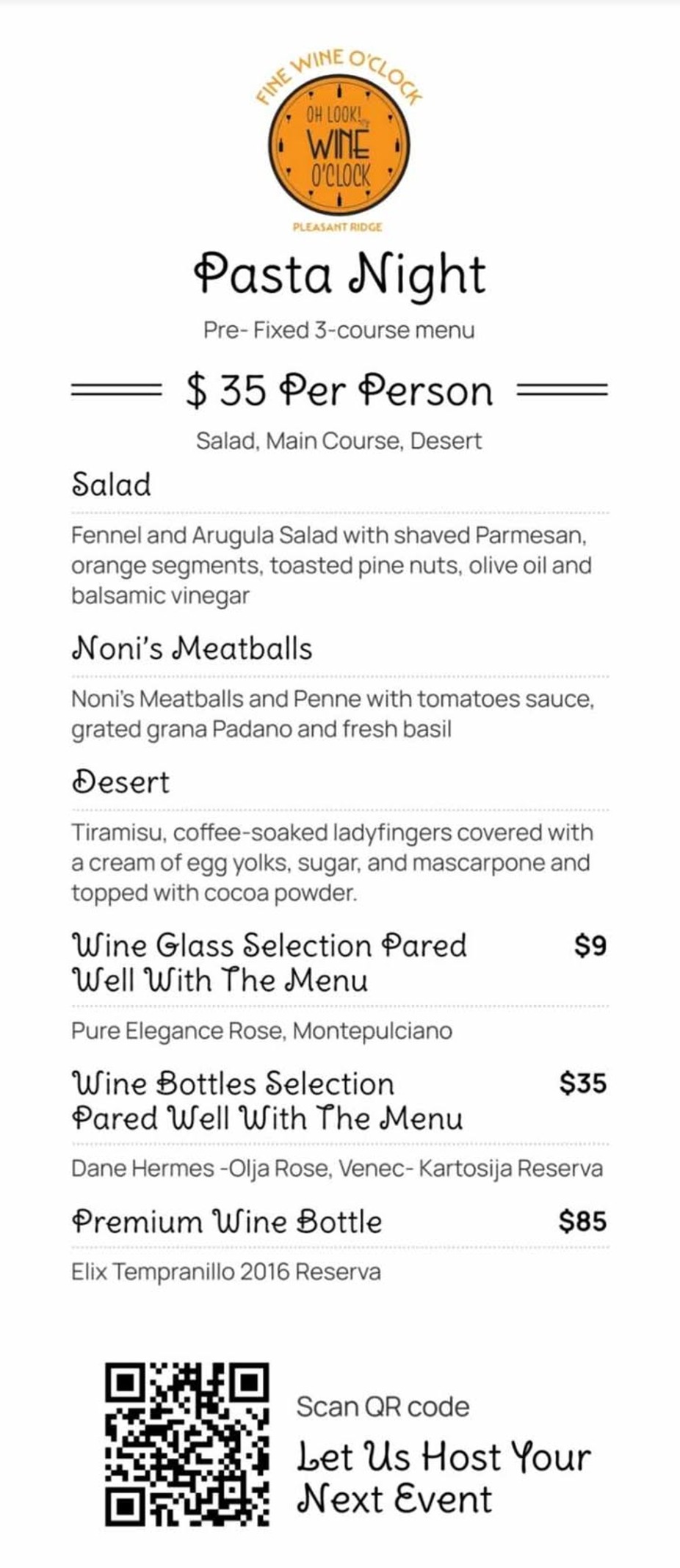 Join us for Pasta night at Fine Wine O'clock!!!